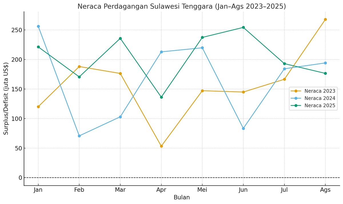 Kendati demikian, neraca perdagangan Sultra Agustus 2025 masih surplus US$176,52 juta, meski lebih rendah dari Agustus 2024 yang mencatat surplus US$194,22 juta.