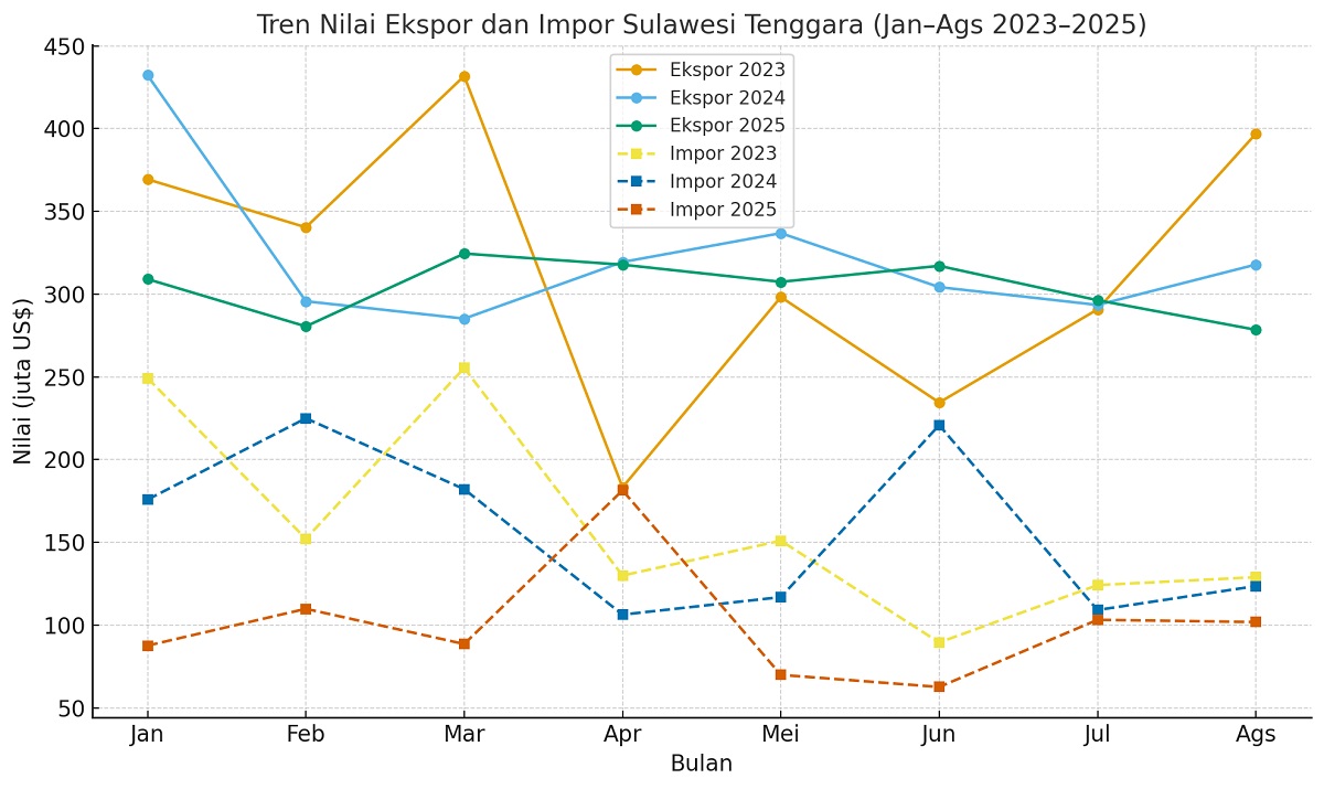 Nilai ekspor Sultra Agustus 2025 tercatat US$278,46 juta, turun 12,40 persen dibanding Agustus 2024 yang mencapai US$317,87 juta. Volume ekspor juga menyusut menjadi 206,23 ribu ton atau turun 10,40 persen. Komoditas utama ekspor tetap didominasi besi dan baja, sementara tujuan utama masih Tiongkok dengan kontribusi lebih dari 93 persen.